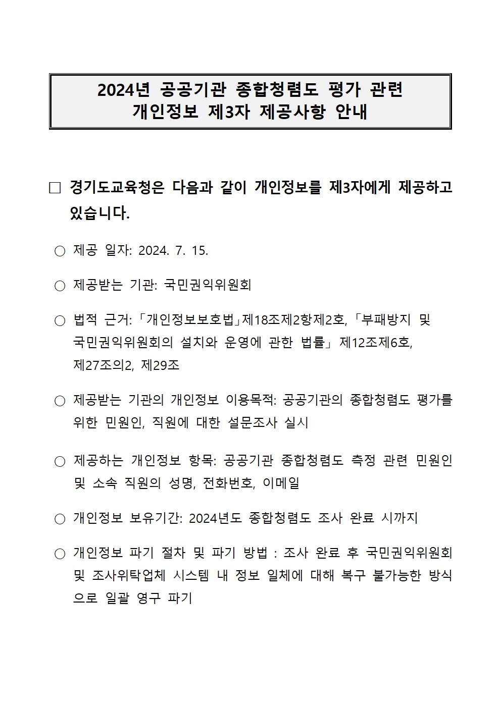 2024년도 공공기관 종합청렴도 평가 관련 개인정보 제3자 제공 안내