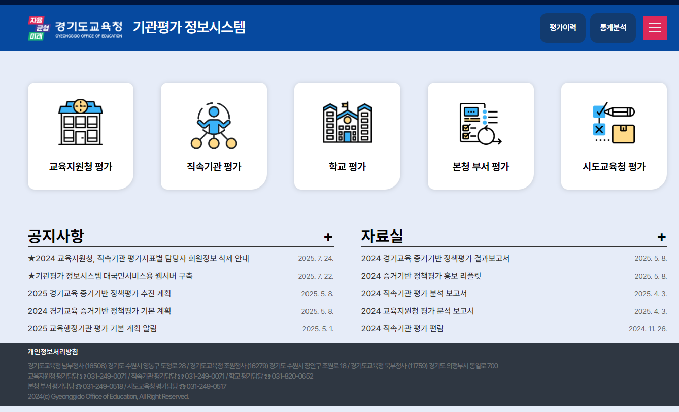 경기도교육청은 2024년 하반기 기관평가 정보시스템(https://eval.goe.go.kr)을 구축하여 기관평가 시 활용하고 있습니다.